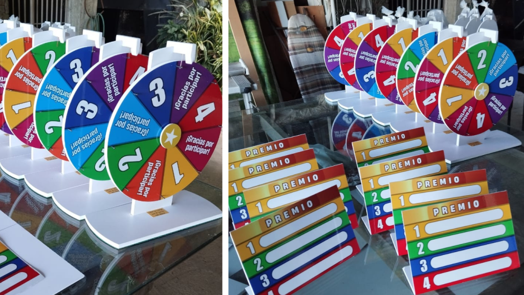 Ruletas de piso y pedestal diseñadas para captar la atención y premiar a tus clientes, fabricadas en PVC rígido y vinil impreso de alta calidad. Perfectas para promociones, señalización o mensajes clave en puntos estratégicos.